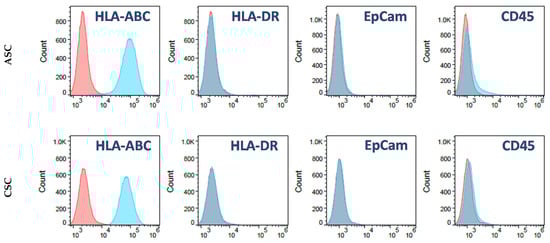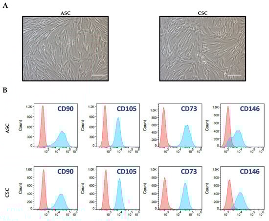 A total 5 × 105 of ASCs and CSCs were cultured in T175 tissue-culture-treated plates containing 30 mL low glucose DMEM medium plus 5% FBS. The culture medium was changed every other day. For the flow cytometry analysis, first-passage ASCs and CSCs were digested with TypLE. After washing with PBS, the cells were resuspended in a cell-staining solution (PBS plus 0.5% Bovine serum albumin (BSA)). The cells were then stained with fluorochrome-conjugated antibodies: IgG isotype-FITC, IgG isotype-PE, IgG isotype-PerCP, IgG isotype-APC, HLA-ABC-FITC, HLA-DR-FITC, CD73-PE, CD45-PE, EpCam-PE, CD146-PerCP, CD90-APC, and CD105-APC (BD Bioscience, San Jose, CA, USA). After 30 min, the stained cells were washed twice with the staining solution. Then, flow cytometry data were acquired by Accuri C6 (BD Bioscience) and analyzed with the FlowJo software (Version 10.7, BD Bioscience, San Jose, CA, USA).