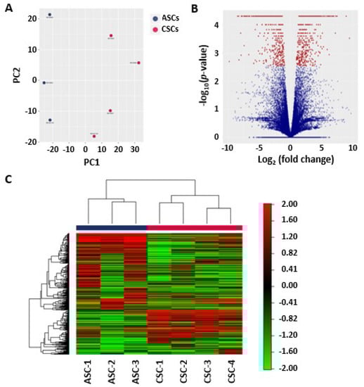 Differential expression patterns between ASCs and CSCs. (A) Principal component analysis (PCA) plot for ASCs and CSCs. The PCA was performed on all samples that passed the quality control using the 500 genes that had the largest coefficients of variation based on the fragments per kilobase of transcript per million mapped fragments (FPKM) counts. Each circle represents a sample. (B) Volcano plot showing the relationship between the raw p-values and the log2-fold change in normalized expression (FPKM) between ASCs and CSCs. (C) Heat map and unsupervised hierarchical clustering by sample and gene were performed on the listed samples using the 500 genes that had the largest coefficients of variation based on the FPKM counts. The data are based on samples from the ASC and CSC groups.