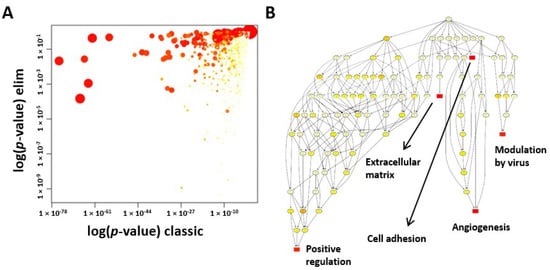 We used GO enrichment analysis to investigate whether specific GO terms were more likely to be associated with the differentially expressed transcripts. Two different statistical tests were used and compared. Firstly, a standard Fisher test was used to investigate enrichment of terms between the two groups. Secondly, the “Elim” method, which takes a more conservative approach by incorporating the topology of the GO network to compensate for local dependencies between GO terms and can mask the significant GO terms, was used. Comparisons of the predictions from these two methods were able to highlight truly relevant GO terms (Figure 3A). We first performed a comparison of the results for the GO terms associated with the significantly differentially expressed transcripts that were identified between the two groups. We generated a scatter plot for significantly enriched GO terms associated with genes that were differentially expressed between the ASCs and CSCs. To illustrate how the different GO terms were linked, we created a GO network (Figure 3B). The top 10 most significant GO terms are given in Table 4. Among them, the most interesting three GO terms are extracellular matrix organization, angiogenesis, and cell adhesion, which are essential for regenerative functions. In particular, the angiogenic function of CSCs drew our attention.
