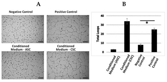 The ASC and CSC culture supernatant dilutions were evaluated in an angiogenesis tube formation assay through stimulation of human umbilical vein endothelial cells (HUVECs; Lonza, Walkersville, MD, USA) to form closed, vessel-like structures. HUVECs were seeded with 1.2 × 104 cells/well on Matrigel (Corning, NY, USA)-coated u-Plate 96-culture wells (Ibidi, Grafelfing, Bayern, Germany). The negative and positive control wells contained endothelial basal medium 2 (EBM-2; Lonza, Walkersville, MD, USA) and endothelial growth medium 2 (EGM-2; Lonza), respectively. The HUVECs were treated with 70 ul of ASC and CSC culture supernatants at 1:4 dilutions in DMEM only, DMEM growth media, and DMEM only. The HUVEC cultures were incubated for 6 h at 37 °C and 5% CO2, and images of representative fields were taken at 4× magnification. The magnitude of the tube formation was quantified with the Wimasis software by the number of closed structures.