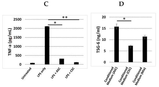 The anti-inflammatory capabilities of CSCs and ASCs were characterized with an inhibition assay of the TNF-α produced by LPS-activated THP-1 cells. A total of 500,000 THP-1 cells were plated per well in a 24-well plate, stimulated with 1 ug/mL of LPS in DMEM growth media, and co-cultured with either CSCs or conditioned media from an overnight culture of CSCs and ASCs in growth media. The untreated THP-1 and LPS-treated THP-1 cells represented the positive control and negative control, respectively. The culture was incubated overnight at 37 °C with 5% CO2. After overnight stimulation and treatment, the cell media were collected, and the amount of TNF-α produced by the THP-1 cells after LPS treatment was compared to those of the CSC and ASC treatments and reported as percent inhibition vs. the control. TNF-α was quantified with Luminex and/or ELISA (R&D Systems).