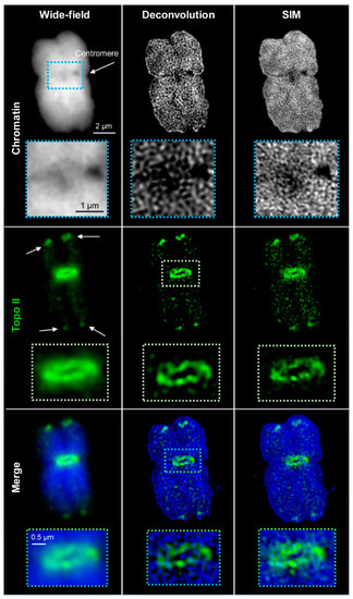 Distribution of topoisomerase II (Topo II) in barley metaphase chromosomes visualized by wide-field, deconvolution, and structured illumination microscopy (SIM) using Alexa488-labeled secondary antibodies. Topo II is accumulated at the subtelomeres (arrows) and the centromere by surrounding it. The enlarged regions (dashed rectangles) show clearly the improved resolution of Topo II and DAPI (4′,6-diamidino-2-phenylindol)-labelled chromatin structures via SIM. Only one representative slice from the Z image stack is shown in all images.