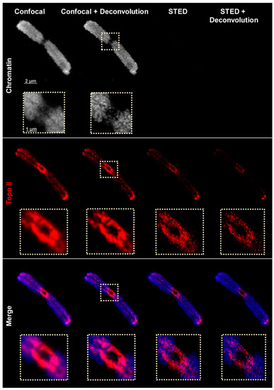 Next, the chromatin structure and Topo II distribution were analyzed by super-resolution microscopy using a Leica TCS SP8 STED 3X confocal microscope. Similar to deconvolved wide-field microscopy, confocal microscopy showed the network-like chromatin structures labeled by DAPI during the flow-sorting of the chromosomes. Due to the properties of the microscope (equipped with a 775 nm depletion laser), STED microscopy can be performed with fluorescence dyes which can be excited at 580 and 635 nm wavelengths. Consequently, chromatin visualizations stained with DAPI cannot be performed by STED. The confocal imaging confirmed the Topo II localization pattern found by spatial wide-field and SIM (Figure 3 and Figure S2). Applying STED microscopy delivering a resolution of ~134 nm revealed more precise structures than SIM (~171 nm resolution). Post-processing of STED images through deconvolution to reduce blur resolved ~72 nm, as measured according to Sparrow [41]. The achieved resolution corresponds to the calibration with 80 nm gold beads. No resolution differences were observed in the two mounting media applied (hardening Diamond and non-hardening DABCO) (Table 3). Because imaging of chromatin (labeled with DAPI) by STED is impossible the confocal DAPI and STED images were merged to colocalize the chromatin and Topo II patterns (Figure 3 and Figure S2).