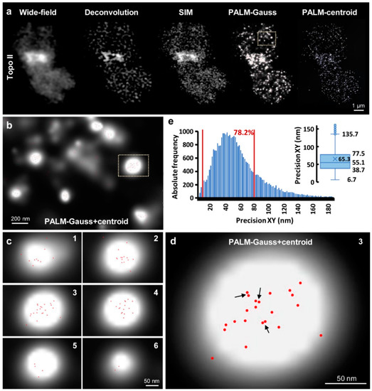 The image resolution is important for assessing biological systems. The development of light microscopy from diffraction-limited wide-field via highly resolved confocal microscopy up to super-resolution techniques enabled the exploration of new structural features through the localization and co-localization of nucleic acids and proteins. To identify higher-order chromatin structures, such as 100–300 nm chromatin fiber loops, a resolution at the border of the diffraction limit is required. Going deeper into the chromatin structure, nucleosome clusters must be detected. These ultra-structures can be identified by SIM and STED microscopy [24]. According to electron microscopy imaging, the diameter of a Topo II dimer is ~15 nm [42], thus in praxis, only SMLM would be able to separate such clusters if in such close proximity.