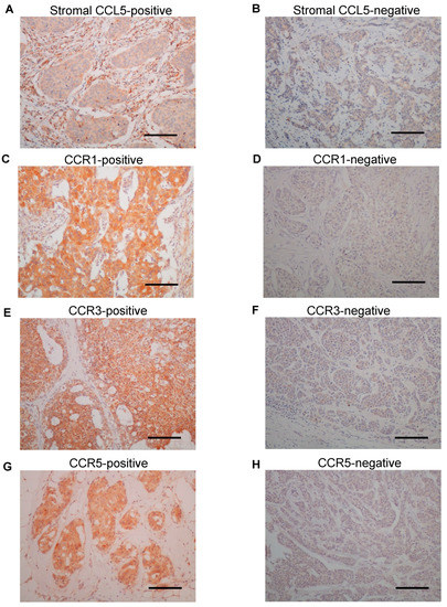 Representative images of immunohistochemistry for CCL5, as well as CCR1, 3 and 5, are shown in Figure 1. Immunoreactivity for CCL5 was detected in both stromal cells (Figure 1A,B) and breast carcinoma cells (Figure S1A,B). On the other hand, the immunoreactivity of CCR1 (Figure 1C,D), CCR3 (Figure 1E,F) and CCR5 (Figure 1G,H) were observed in the cytoplasm of breast carcinoma cells. According to the scoring criteria as described in the Materials and Methods, 35% (39 out of 111 case), 19% (21 out of 111 cases), 65% (72 out of 111 cases) and 41% (45 out of 111 cases) were considered positive for CCL5 in stromal cells and CCR1, 3 and 5 in carcinoma cells, respectively.