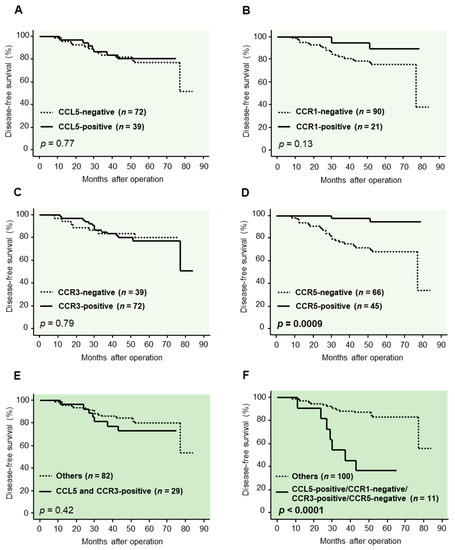 We then compared the survival curves in the CCL5-positive/CCR3-positive cases and other cases, but no significant correlation was detected (Figure 2E). On the other hand, as shown in Figure 2F, the risk of recurrence was significantly higher in the CCL5-positive/CCR1-negative/CCR3-positive/CCR5-negative cases compared with other patients (p < 0.0001).