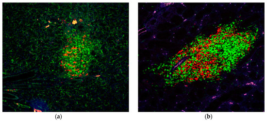 Histological photomicrographs depicting lymphocytic infiltrations (lymphocytic foci (LF)) present within the salivary glands of both C57BL/6J (a) and C57BL/6.NOD-Aec1Aec2 mice (b) at 7 months of age. While the infiltrations within the salivary glands of both mouse strains contain both T cells (green fluorescence) and B cells (red fluorescence), both the transcriptomes and immunological activities are very different from each other. During the early disease stages, LF of our SSS mice contain higher numbers of B cells; however, at later stages, the T lymphocyte population(s) tend to overtake the number of B lymphocytes. In addition, the LF of the SSS mice are strongly periductal.