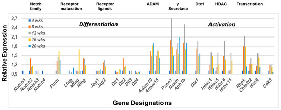 In agreement with our hypothesis, together with salivary gland pathology and histology, our temporal global transcriptome profiling analyses of C57BL/6.NOD-Aec1Aec2 salivary glands indicate an early activation of Notch2 and the Notch2 signal transduction pathway, as presented in Figure 2. Based on the specific upregulated genes concomitantly expressed, the signal transduction pathway defined is Notch2 > Furin > Rfng/Mfng > Dll2 > Adam10 > γSecretase > Dtx1 > HDAC > Rbpk > Cbfat2 > Hes6, a pathway leading to Notch-specific gene transcription capable of regulating multiple cell functions, including activations of Nfkβ1 (encoded by nuclear factor kappa b subunit 1) and type 1 interferon (Ifn1, encoded by Ifna1). This early appearance also corresponds with the first observation of migration and infiltration of B cells into the salivary glands noted histologically [32]. In addition, the transcriptome data reveal that MZB cells entering the salivary glands at 8 weeks of age undergo both ontogenesis and cell activation. Furthermore, by 16 weeks of age, the transcriptome profile reveals the second wave of Notch2 activation, thereby prolonging the activated state. While these profiles correspond with the onset of the inflammatory/innate response and initiation of the early adaptive response, respectively, within the salivary gland, they do not specify if this is a single continuous event or a time-dependent multiple independent action.