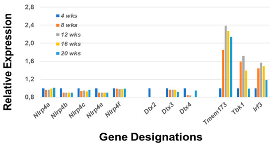 Each salivary gland RNA sample was hybridized onto an Affymetrix 3′ Expression Array GeneChip Mouse Genome 430 2.0 array and annotated (build 32; 06.09.2011), while verification of the RNA results was carried out on randomly selected genes using real-time polymerase chain reaction (rt-PCR) analyses. Microarray data are deposited with Gene Expression Omnibus, accession numbers GSE15640 and GSE36378. A recent extensive and fully detailed analysis of our transcriptome data can be seen in our previous publication [31]. For the current manuscript, we present some abbreviated transcriptome datasets, e.g., 12-, 16- and 20-week-old SS-susceptible (SSS) C57BL/6.NOD-Aec1Aec2 mice or 12- and 16-week-old SS-non-susceptible (SSNS) control C57BL/6J mice, as these are timeframes for early lymphocytic foci development in the salivary glands of C57BL/6.NOD-Aec1Aec2 mice.