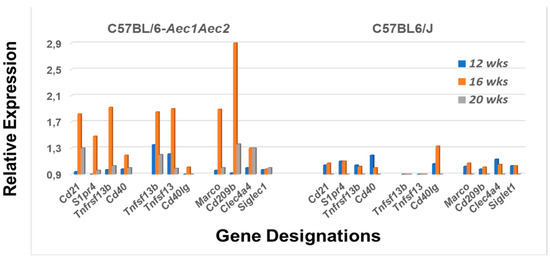 In addition to B cell receptors (BCRs), toll-like receptors (TLRs) and Notch2, MZB cells also express Cr2 (the complement receptor encoded by Cd21), S1pr (the sphingosine-1-phosphate receptor encoded by S1pr4), TACI (encoded by Tnfrsf13b) and IL22 receptor (encoded by Il22ra) [24,37]. Furthermore, MZB cells can be activated by MZ macrophages expressing DCIR (encoded by Clec4a4), macrophage receptor with collagenous structure (encoded by Marco) and SIGN-R1 (encoded by Cd209a) or by metallophilic macrophages expressing Cd169 (encoded by Siglec1) [38]. As shown in Figure 4, each of these genes, with the exception of Siglec1, exhibits upregulated expression in the salivary glands of C57BL/6.NOD-Aec1Aec2 mice and does so in a simultaneous manner around 4 months of age. In contrast, no significant upregulated gene expression was observed for this same set of receptors in the salivary glands of C57BL/6J mice at the same age. In addition, genes encoding Tnfsf13 (April) and Tnfsf13b (Baff), the two specific ligands for Tnfrsf13b, also exhibit upregulated expression in the SS-susceptible mice, but not in the C57BL/6J mice, at 4 months. Interestingly, neither Cd40 (the gene encoding Cd40) nor Cd40l (the gene encoding the Cd40 ligand) were upregulated in the salivary glands of C57BL/6.NOD-Aec1Aec2 mice, while C57BL/6J mice actually showed minimal, but not significant, CD40lg upregulation (Figure 4).