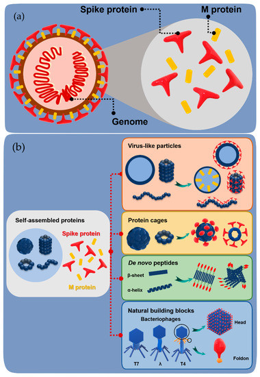 General structure of a pathogen and construction of subunit vaccines. (a) Schematic representation of the basic structure of a virus containing spike and membrane protein (M protein) on the surface and the genome inside. (b) Schematic representation of the construction of subunit vaccines by fusion of spike/M protein with various self-assembled proteins.