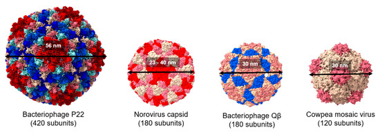 An interesting and useful aspect of virus-like particles in the context of vaccine development is that they are particulate and have repetitive structures which can provide arrays of the immunogenic antigens required for the induction of a potent antibody response. VLPs are thus one of the most common platforms used in vaccine agents used in prevention of infectious diseases, cancer, and brain diseases [10,14,15,16,17,18]. The immunogenicity achieved by displaying antigens on VLPs is assumed to be similar to that of the natural virus particle due to specific interactions with pattern recognition receptors of dendritic cells (DCs) [14]. Typical VLPs include bacteriophage P22 (P22), bacteriophage Qβ (Qβ), norovirus capsid, and cowpea mosaic virus (CPMV), among others (Figure 2).