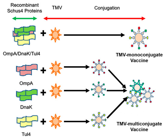 In addition to VLPs with spherical and filament morphology, a hollow tubular VLP has been employed as a versatile platform for displaying target antigens and pathogens. One of the most useful platforms is tobacco mosaic virus (TMV), which has been investigated in vaccine development for several diseases such as cancer [33], tularemia [34] and malaria [35]. TMV has been developed as a delivery platform for vaccine applications because it can carry antigen and stimulate cellular responses without requiring additional adjuvants, and because it is not a human pathogen. McCormick and co-workers demonstrated that T-cell mediated immunogenicity and tumor protection could be achieved by chemical conjugation of synthetic peptides to TMV without any additional adjuvant [36]. Banik et al. created a novel multivalent TMV-based delivery carrier by adding a mixture of proteins. The multivalent subunit vaccine contains a mixture of Francisella tularensis protective antigens: OmpA-like protein (OmpA), chaperone protein DnaK and lipoprotein Tul4. TMV can be used as a basis for monoconjugate and multiconjugate vaccines to provide highly efficient humoral responses (Figure 5) [34].