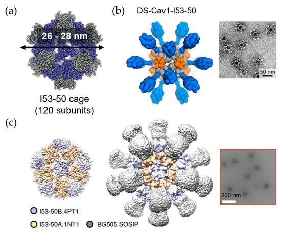 The utilization of I53-50 cage in vaccine design. (a) Design of I53-50 cage composed with 120 subunits of two component proteins. Modified from [71]. Reprinted with permission from American Association for the Advancement of Science (AAAS). (b) The utilization of I53-50 as a carrier for respiratory syncytial virus antigen (DS-Cav1) conjugation; and (c) HIV-1 antigen (BG505 SOSIP) conjugation with negative stain electron microscopy (EM) images on the right side, respectively. Reproduced with modification from [72] and [73].
