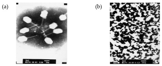 The head of bacteriophage T4 as a pathogenic display system. (a) Negatively stained image of the recombinant T4-3C phage particles (scale bar: 50 nm, magnification 12kx); (b) aggregation–precipitation of phages due to the addition of pig anti- foot-and-mouth disease (FMDV)-O antibody into the mixture of E. coli BL21 (DE3) infected phage T4-P1 and recombinant T4-3C phage particles (scale bar: 500 nm, magnification 12kx). Reprinted from [103], copyright (2008), with permission from Elsevier.