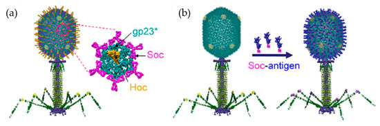Scheme of the bacteriophage T4 nanoparticle platform and assembly design. (a) Structural model of phage T4 with the major capsid protein gp23* (cyan) (the asterisk shows that it is the cleaved form) (930 copies), soc (magenta) (870 copies), and hoc (yellow) (155 copies). (b) In vitro assembly of Soc-fused antigen (blue) molecules on hoc_ soc_ T4 phage capsid. Reprinted from [104].