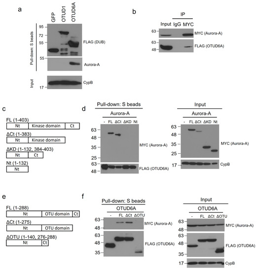 Next, we examined which domain(s) on OTUD6A interact(s) with Aurora-A. We generated two truncated mutants of OTUD6A: OTUD6AΔCt (C-terminal-deleted, aa 1–275) and OTUD6AΔOTU (OTU-domain-deleted, aa 1–140 & 276–288) (Figure 3e). With the OTUD6A mutants, we conducted a binding assay with Aurora-A. We transiently co-transfected MYC-tagged Aurora-A plasmid and each SFB-tagged truncated OTUD6A mutant plasmid along with full-length wild-type OTUD6AFL (aa 1–288) into HEK293T cells and pulled down each OTUD6A with S-protein beads. As shown in Figure 3f, OTUD6AFL and OTUD6AΔCt interacted but OTUD6AΔOTU did not interact with Aurora-A, which implies that Aurora-A binds to the OTU domain of OTUD6A.