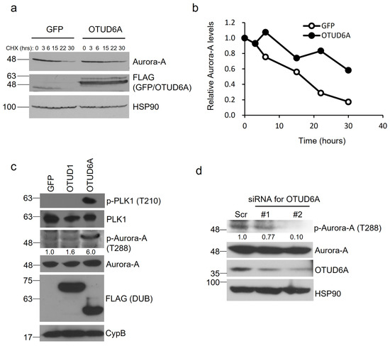 To determine whether OTUD6A-mediated deubiquitination increases protein stability of Aurora-A, we transfected SFB-tagged OTUD6A into HEK293T cells and treated the cells with cycloheximide at 50 μg/mL for the indicated period. When normalized following quantitation, the protein half-life of Aurora-A was improved from ~17 to ~33 h by OTUD6A (Figure 4a,b).