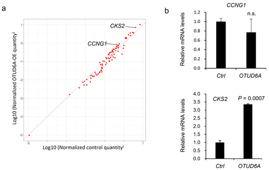 Aurora-A is an important cell cycle regulator during mitosis and is reported to regulate target gene transcription in a kinase activity-dependent manner. For example, Aurora-A affects target gene expression by stabilizing YAP transcription coactivator [29], and by phosphorylating at Serine 10 of histone H3 and the Runt-related transcription factors (RUNX) [30,31]. Therefore, we asked what cell cycle-regulating gene is the most upregulated by OTUD6A-mediated deubiquitination of Aurora-A. To address this question, we utilized qPCR screening kit which profiles cell cycle-regulating genes. Compared to the control, CCNG1 (Cyclin G1) and CKS2 (Cyclin-dependent kinases regulatory subunit 2) were two of the most upregulated genes in OTUD6A-transfected HEK293T cells in the screening (Figure 5a). We conducted an independent validation and found that CKS2 was significantly upregulated by OTUD6A overexpression (Figure 5b).