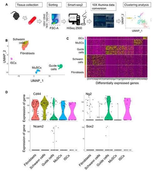 Single-Cell RNA Sequencing reveals the presence of guide cells expressing CD44, Ng2, and Ncam2. (A) Flowchart showing the isolation of single cells from murine hind limbs with Smart-seq2 yielding cellular and phenotypic relationships. (B) UMAP plot and k-means clustering of 256 cells from murine skeletal muscle identifying five clusters, fibroblasts, Schwann cells, guide cells, activated satellite cells (MuSCs), and interstitial stromal cells (ISCs, as reported in [26]). Every point represents one cell. (C) Heatmap of k-means clusters of differentially expressed marker genes. (D) Violin plot with median visualizing marker genes (Cd44, Ng2, Ncam2, and Sox2) for the identified clusters.