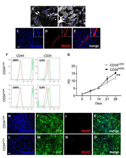 Characterization of the CD34LOW and CD34HIGH positive guide cells. (A,B) Confocal images of cardiac (panel A) and skeletal muscle (panel B) mesoangioblasts showing co-expression of CD44 (green), CD34 (far-red), and Ncam2 (red). 5-azacytidine induced differentiation of the cardiac mesoangioblasts. Arrowheads indicate triple-positive cells. Scale bar (40 µm) is the same for panels A and B. (C–E) 5-azacytidine induced differentiation of the cardiac mesoangioblasts. (C) Hoechst nuclei staining, (D) myosin heavy chain (MyHC) immunofluorescence, (E) merge of panels C-D. Scale bar (40 μm in C) is the same for panels D and E. (F) Fluorescence-activated cell sorting (FACS) analysis of the surface markers (CD44 and CD34) in the guide cells. Green peaks indicate the positive cells for CD34 or CD44 with respect to isotype negative control in red. (G) Population doublings of the CD34LOW and CD34HIGH cells; ** p ≤ 0.01. (H–O) Myosin expression analysis in the CD34LOW and CD34HIGH positive cells. (H and L) Hoechst nuclei staining of CD34LOW (H) and CD34HIGH cells (L); (I and M) GFP immunofluorescence of the CD34LOW (I) and CD34HIGH cells (M); (J and N) myosin heavy chain (MyHC) immunofluorescence analysis of the CD34LOW (J) and CD34HIGH cells (N) after 5-azacytidine treatment; (K) merge of H, I, and J panels; (O) merge of L, M, and N panels; scale bar in L (20 μm) is the same for all the panels.
