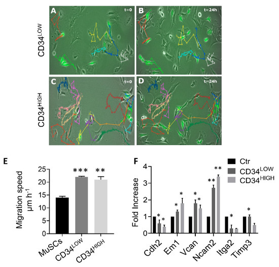 We recently reported single cell RNAseq analysis in dystrophic and healthy murine skeletal muscles [26] and we reanalyzed the cell types based on the differentially expressed genes using UMAP (uniform manifold approximation and projection) dimension reduction, as reported in the flowchart (Figure 1A). Clustering resulted in five groups that were annotated as fibroblasts, Schwann cells, activated satellite cells (MuSCs), interstitial stromal cells (ISCs), or the novel guide cells, characterized by a distinct transcriptome profile (Figure 1B,C). Guide cells cluster was characterized by the expression of several marker genes including Cd44, Ng2, Ncam2, and Sox2 (Figure 1D). In order to investigate the physiological role of this cell population we isolated interstitial muscle cells as previously described [18,19,20]. In particular, muscles were collected from 1-week-old C57 mice and, under a stereo-microscope, dissociated into small fragments and plated on 1% gelatin [27]. After initial growth of fibroblasts, poorly adherent cells appeared and were isolated by gently pipetting. With a time-lapse system we could observe that, although scanty, there were spindle cells characterized by high-speed movements that seemed to direct and “guide” the behavior of the other cells (Video S1). Interestingly, these muscle cell populations’ rare spindle cells showed co-expression of CD44, Sox2, and Ncam2 (Figure 2A,B) as identified in the guide cells cluster by scRNAseq analysis. CD44 is one of the most important markers for myoblast cell motility. In fact, CD44-/- muscle stem cells show defects in cell movement as well as in vitro differentiation. Sox2 and Ncam2 are considered neural stem cell markers [28,29]. However, those interstitial cells expressed terminal differentiation markers (i.e., myosin heavy chain) (Figure 2C–E) when exposed to low serum and 5-azacytidine treatment suggesting a contamination of muscle mesoangioblasts. Thus, to further isolate “guide” cells we proceeded to differentiate the cells with two rounds of culture in 5-azacytidine and low serum medium for 5 days. Undifferentiated cells were then detached by trypsin treatment and cloned by progressive dilution. Two cell populations were derived from five mice, then selected and characterized (Figure 2, panels F–O). Both cell populations were 100% positive for CD44 but differently expressed CD34 (4.8% in the case of CD34LOW cells and 9.8% in the case ofCD34HIGH cells) (Figure 2F). Instead both cell populations were negative for CD13, CD31, and CD45 (data not shown). Figure 2G reports the growth curves of the two cell populations. The trends were constant and similar until seven population doublings (PD). After that point, the proliferation rate became slightly divergent for the two guide cell populations, and particularly slower for the CD34HIGH cells. Once exposed to low serum medium both CD34LOW and CD34HIGH cells were viable but did not express myosin anymore (Figure 2, panels H and L). Interestingly, both CD34LOW and CD34HIGH cell populations maintained highspeed movements (Video S2 and Video S3). A quantitative analysis of the cells’ speed is reported in Figure 3. In particular, the speed of the CD34LOW (GFP-labeled, Figure 3A,B) and CD34HIGH cells (GFP-labeled Figure 3C,D) was measured together with the speed of the MuSCs. Both CD34LOW andCD34HIGH cells showed significantly higher speed compared to MuSCs (Figure 3E). Moreover, we investigated the expression of extracellular matrix and adhesion molecules involved in cell migration by PCR arrays and by quantitative RT-PCR (qRT-PCR). Results are shown in Figure 3F. The expression of genes involved in cell adhesion and migration has been analyzed—N-cadherin (Cdh2) is involved in neural cell adhesion and migration [30]. Emilin-1 (Em1) regulates smooth muscle cell activity in vessel diameter determination [31], the proteoglycan versican (Vcan) is a crucial marker involved in heart development [32], neural cell adhesion molecule 2 (NCAM2) [33] was the highest expressed marker in both cell populations, and integrin alpha2 (Itga2) and metalloproteinase3 inhibitor (Timp3) regulate endothelial cell migration [34].