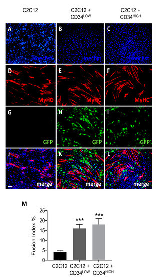 Myogenic differentiation (5 days) of C2C12 cells co-cultured with guide cells. (A–C) Hoechst nuclei staining of C2C12 (A), C2C12 co-cultured with CD34LOW (B), or with CD34HIGH cells (C); (D–F) myosin heavy chain (MyHC) immunofluorescence analysis on C2C12 (D), on C2C12 co-cultured with myosin heavy chain (MyHC) immunofluorescence analysis on C2C12 (D), on C2C12 co-cultured with CD34LOW (E), or with CD34HIGH cells (F); (G–I) GFP immunofluorescence analysis of C2C12 (G), C2C12 co-cultured with CD34LOW (H), or with CD34HIGH (I) guide cells; (J) merge of panels A, D, and G. (K) merge of panels B, E, and H. (L) merge of panels C, F, and I. (M) Fusion index of C2C12, C2C12 co-cultured with CD34LOW or with CD34HIGH cells; *** p < 0.001. Scale bar 30 μm for all panels.