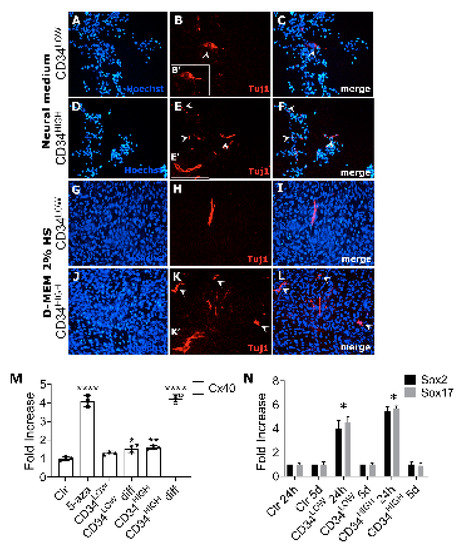 Since guide cells determined a significant increase of CSA (Figure 5) and TA weights (Figure S2) of injected muscles without participating directly to myogenesis, we wondered if the observed muscle hypertrophy could be due to nervous stimulation following cell injection. We then studied neural differentiation in vitro of the two guide cell populations, characterizing the expression of specific markers after treatment with neural inductive medium or low serum medium. Both guide cell populations were positive for III beta-tubulin (Tuj1) either after neural induction medium addition or serum deprivation (Figure 6A-L) confirming that CD34LOW and CD34HIGH cells could show a neural phenotype in appropriate culture conditions. Moreover, we observed that CD34HIGH cells showed up-regulation of the cardiac pacemaker marker Connexin 40 [39] when induced to differentiate by low serum treatment (Figure 6M). Finally, since NCAM2 expression was increased in the guide cells, we also investigated the expression of the neural stem cell markers like Sox2 and Sox17 (Figure 6N). Sox2 is involved in the maintenance and differentiation of neural stem cells [29]. Sox17 is involved in oligodendrocytes survival in models of de-myelination and multiple sclerosis. Both the genes were significantly up-regulated in the proliferating guide cells (24 h). After 5 days of differentiation for both CD34LOW and CD34HIGH cells, the levels decreased and became similar to the control.
