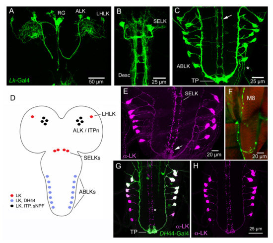 - De Haro, M.; Al-Ramahi, I.; Benito-Sipos, J.; Lopez-Arias, B.; Dorado, B.; Veenstra, J.A.; Herrero, P. Detailed analysis of leucokinin-expressing neurons and their candidate functions in the Drosophila nervous system. Cell Tissue Res. 2010, 339, 321–336. [Google Scholar] [CrossRef]