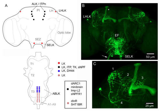 - Zandawala, M.; Yurgel, M.E.; Liao, S.; Texada, M.J.; Rewitz, K.F.; Keene, A.C.; Nässel, D.R. Modulation of Drosophila post-feeding physiology and behavior by the neuropeptide leucokinin. PLoS Genet. 2018, 14, e1007767. [Google Scholar] [CrossRef] [PubMed]