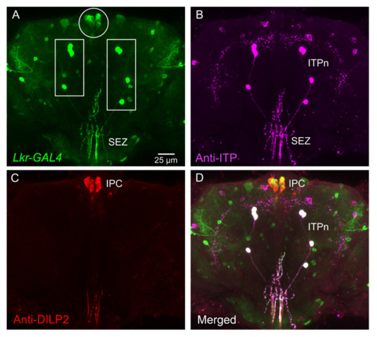 - Galikova, M.; Dircksen, H.; Nässel, D.R. The thirsty fly: Ion transport peptide (ITP) is a novel endocrine regulator of water homeostasis in Drosophila. PLoS Genet. 2018, 14, e1007618. [Google Scholar] [CrossRef]