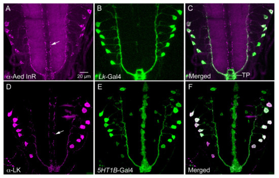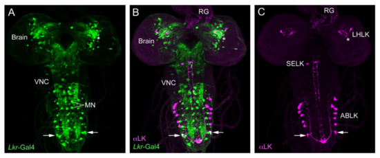 2.2. Localization of LK and LKR in Drosophila and Colocalization with Other Neuropeptides