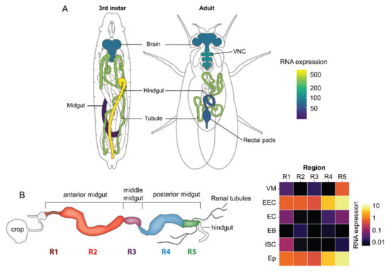 - Dutta, D.; Dobson, A.J.; Houtz, P.L.; Gläßer, C.; Revah, J.; Korzelius, J.; Patel, P.H.; Edgar, B.A.; Buchon, N. Regional Cell-Specific Transcriptome Mapping Reveals Regulatory Complexity in the Adult Drosophila Midgut. Cell Rep. 2015, 12, 346–358. [Google Scholar] [CrossRef] [PubMed]