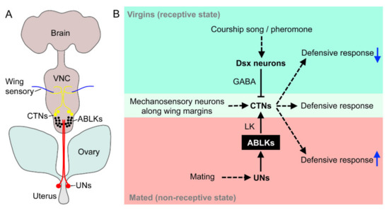 | Regulation of mechanosensory-induced defensive post-mating response in females | Adult | ABLK | [118] |