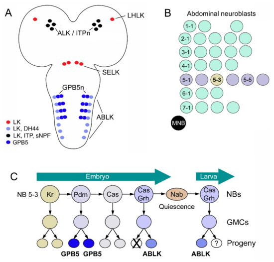 - Benito-Sipos, J.; Estacio-Gómez, A.; Moris-Sanz, M.; Baumgardt, M.; Thor, S.; Díaz-Benjumea, F.J. A genetic cascade involving klumpfuss, nab and castor specifies the abdominal leucokinergic neurons in the Drosophila CNS. Development 2010, 137, 3327–3336. [Google Scholar] [CrossRef] [PubMed]