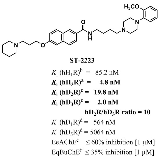 Chemical structure of the multi-targeting ligand ST-2223 with affinities at hH3R, hD2R and hD3R. a [3H]Nα-methylhistamine binding assay, performed with cell membrane preparation of Human embryonic kidney (HEK) cells stably expressing the human H3R (n = 4) [44,45]. b [3H]pyrilamine binding assay, performed with cell membrane preparation of Chinese hamster ovary (CHO) cells stably expressing the hH1R (n = 2). c,d Displacement assay was carried out as described previously, using membrane suspension of cell lines stably expressing the human dopamine hD1Rs and hD5Rs (HEK) against [3H]SCH23390 and hD2SRs, hD3Rs (CHO) using [3H]spiperone (n = 3) [44,45]. e AChE: Acetylcholine esterase; Ee; electric eel (preliminary data); f BuChE: Butyrylcholinesterase;Eq: equine (preliminary data) (n = 2) [46].