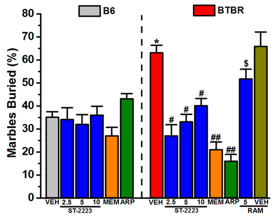 The effects on spontaneous self-grooming in BTBR and B6 mice are shown in Figure 3. The results of the two-way ANOVA showed that there was a significant main effect for strain, treatment and strain × treatment interaction, with values of (F(1,48) = 97.54, p < 0.01), (F(5,48) = 30.85, p < 0.01), and (F(5,48) = 11.38, p < 0.01), respectively. Post hoc tests revealed that vehicle-treated BTBR (161.20 ± 7.69 s) spent significantly more time grooming when compared to B6 mice (62.20 ± 5.32 s), with values of (F(1,8) = 81.69, p < 0.01). ST-2223 (5 and 10 mg/kg, i.p.) significantly, and dose-dependently, decreased the time spent self-grooming in BTBR mice, with values of (F(1,8) = 29.43, p < 0.01) and (F(1,8) = 29.56, p < 0.01), respectively. However, ST-2223 (2.5 mg/kg, i.p.) failed to significantly mitigate the self-grooming behavior of treated BTBR mice (p = 0.23). Interestingly, the reducing effect observed with 10 mg/kg of ST-2223 on self-grooming behavior was significantly higher than that witnessed with the lower dose (5 mg/kg) of the same compound, with values of (F(1,8) = 7.97, p < 0.05). The reference drugs MEM (5 mg/kg, i.p.) and ARP (1 mg/kg, i.p.) significantly reduced the self-grooming time of BTBR mice with values of (F(1,8) = 186.96, p < 0.01) and (F(1,8) = 20.89, p < 0.01), respectively (Figure 3). In B6 mice, ST-2223 (2.5, 5, and 10 mg/kg, i.p.) and ARP (1 mg/kg, i.p.) did not alter the time spent self-grooming (all p’s > 0.05). However, MEM (5 mg/kg, i.p.) significantly reduced the self-grooming time of treated B6 mice with values of (F(1,8) = 19.50, p < 0.01) (Figure 3). As depicted in Figure 3, and following the post hoc analyses of the observed results, the ST-2223 (5 mg)-induced decrease in the duration of time spent displaying self-grooming behaviors, was nullified by co-administration with RAM (10 mg/kg, i.p.), with values of (F(1,8) = 27.52; p < 0.001), as compared to the ST-2223 (5 mg)-treated BTBR mice (Figure 3). Interestingly, systemic pretreatment of BTBR mice with RAM (10 mg/kg, i.p.) did not alter the behaviors of tested mice in the MBT, with values of (F(1,8) = 0.11; p = 0.72) as compared to the vehicle-treated BTBR mice (Figure 3).