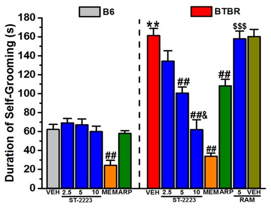 Consequently, assessing the levels of different brain neurotransmitters, including HA and DA, in different brain areas of BTBR mice with ASD-like behaviors, as well as after pre-treatment with ST-2223, would further help to understand which neural circuits may be involved in this observed improvement in self grooming. In addition, our current observations demonstrate that the NMDAR antagonist MEM significantly rescued self- grooming in BTBR mice. These results are in accordance with a previous study in which suppression of elevated NMDAR function in a VPA mouse model of ASD was found to normalize repetitive behaviors [70]. However, in B6 mice, there was no appreciable trend for ST-2223 in altering the normal level of self-grooming, while MEM tended to decrease self-grooming without altering the locomotor activity of B6 mice, as observed in the open field test (Figure 3 and Figure 5). The latter observations may explain the specific involvement of NMDAR and gluatamate transmission in self-grooming in dysregulated and normal conditions. Notably, self-grooming is an innate behavior and is the most frequently occurring awake behavior displayed by laboratory mice [71,72]. When the grooming patterns is not in a ritualistic manner and occurs sequentially and systematically, it resembles compulsive-like behaviors expressed in some ASD individuals and in other psychiatric disorders [71,72]. ST-2223 (5 and 10 mg/kg) decreased the elevated level of self-grooming of the whole body that is significantly elevated in BTBR mice reflecting RRB. On the other hand, all doses of ST-2223 showed no effect on the normal self-grooming displayed by B6 control mice, excluding any confounding effect of the test compound. Moreover, ST-2223 was unable to restore hyperactivity in BTBR mice, excluding any drug-induced depression like behaviors, or impaired motor function. Our observations are in agreement with the reported principal symptoms that characterize clinical depression seen in stressed animals, including decreased motor activity [73].