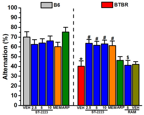 ST-2223 treatment enhances spontaneous alternation behavior in BTBR mice. Spontaneous alternation behavior was measured in B6 and BTBR mice. Each mouse received an i.p. injection of vehicle, ST-2223 (2.5, 5.0, or 10 mg/kg, i.p.), MEM (5 mg/kg, i.p.), or ARP (1 mg/kg, i.p.) 30–45 min prior to assessment of alternation behavior. BTBR mice demonstrated a significantly reduced percentage of spontaneous alternation behavior compared to that of B6 mice. Vehicle, ST-2223, MEM, or ARP treatment did not affect spontaneous alternation behavior in B6 mice. ST-2223 (2.5, 5 and 10 mg/kg, i.p.) and MEM (5 mg/kg, i.p.) significantly mitigated the decreased alteration behavior in BTBR mice. ARP (1 mg/kg, i.p.) failed to alter the decreased alternation behavior of BTBR mice. The effects of systemic co-injection of RAM (10 mg/kg, i.p.) on the ST-2223 (5 mg)-induced enhancement of the alternation behavior of BTBR mice were also assessed. Data are expressed as the mean ± SEM percentage of spontaneous alternation (n = 5). * p < 0.05 vs. vehicle-treated B6 mice. # p < 0.05 vs. vehicle-treated BTBR mice. $ p < 0.05 vs. ST-2223 (5 mg)-treated BTBR mice.