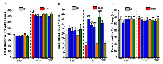 The effects of ST-2223 on locomotor activity, as well as anxiety levels, were examined in order to exclude any false-positive effect in the behavioral tests. The results observed indicated that systemic treatment with ST-2223 in control B6 mice has no aversive effects in the open field test, indicating that ST-2223 does not change the baseline levels of motor, exploratory, or anxiety behaviors. However, ST-2223 significantly increased the amount of time spent by BTBR mice in the central arena, confirming the ability of ST-2223 to modulate anxiety-associated fear levels. In contrast, ST-2223 failed to restore hyperactivity, as no effect was exhibited with all doses on the total distance travelled (Figure 5). Consequently, and because ST-2223 treatment had no effect on locomotor activity in BTBR mice, the drug-induced reduction in marble burying and alternation behaviors cannot be explained by a more general reduction in activity. Instead, the results suggest that regulation of histaminergic and dopaminergic systems selectively modulated RRBs in BTBR mice. In contrast with a previous study [75], MEM failed to show significant anxiolytic effects in the open field test, a discrepancy that may be explained with the difference in dose regimen or anxiety level state in different mouse strains. Moreover, the failure of ST-2223 (at all doses), MEM and ARP to restore the hyperactivity observed in BTBR mice may have been due to the excitatory (Glu) and inhibitory (GABA) neurotransmitter imbalance which is well known to exist, as such an imbalance was observed in several clinical trials in patients with ASD [76,77,78,79]. However, a previous randomized clinical trial showed that following 6 weeks of treatment of MEM, this may be considered as an alternative to methylphenidate in children with attention deficit hyperactivity disorder (ADHD), characterized by lack of attention and hyperactivity [80]. Taken together, the current collective observations suggest that chronic treatment with MEM may be effective with regard to reducing anxiety and hyperactivity.