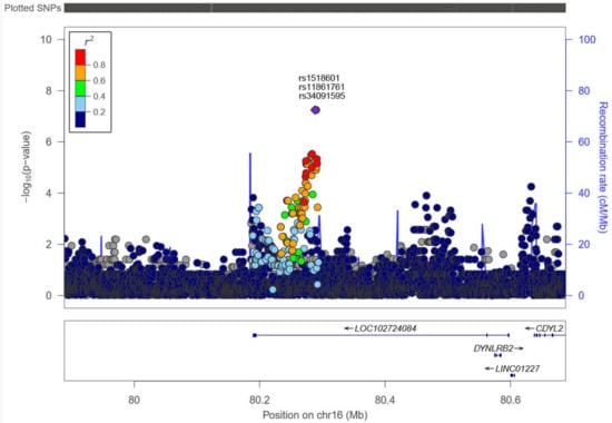 | rs34091595 | 16 | 80289643 | LOC102724084 Intron variant | T | C | 5.652 × 10−8 |
