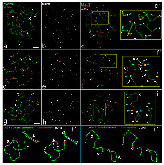 CDK2 localization in meiotic chromosomes of the rat R. norvegicus. SCs were immunostained using antibodies to SYCP3 protein (green), centromeres using antibodies to proteins of kinetochores (CREST, red), and CDK2 kinase using antibodies to CDK2 (white). Blue arrowheads point to the telomeric localization of Cdk2. White arrows point to the interstitial CDK2 location. Pink arrows outline numerous CDK2 signals in asynaptic segments of the sex bivalent. A—autosomal bivalents. XY—sex chromosomes. (a–c) Mid zygotene. Asynapsis in several bivalents is marked as a white stars; (d–f) Mid pachytene; (g–i) Diplotene. Desynapsis in several bivalents is marked as yellow stars. (c’,f’,i’)—enlarged parts of the relevant photos. (f’,i’)—schemes of some meiotic chromosomes in (f’,i’). Scale bar (a–i) = 5 µm.