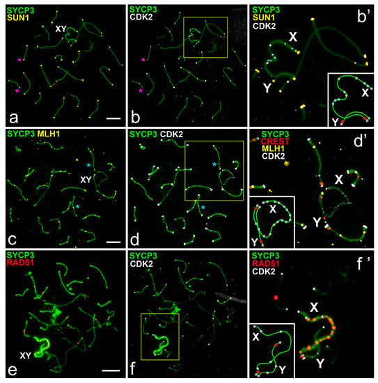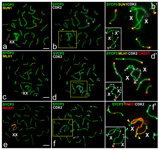 CDK2, SUN1, MLH1, and RAD51 distribution in meiotic chromosomes of spermatocytes of the mole vole E. talpinus. SCs were immunostained using antibodies to SYCP3 protein (green), centromeres–antibodies to proteins of kinetochores (CREST, red), and kinase CDK2 using antibodies to CDK2 (white). Schemes of sex chromosome synapsis, centromeric regions (red), and CDK2 (white) foci are shown in the insets (b’,d’,f’). Pink stars point to non-colocalization of the SUN1 and CDK2 foci in autosomal bivalent. Blue stars point to non-colocalization of the MLH1 and CDK2 foci in some autosomal bivalents. (a,b) CDK2 (white) and SUN1 (yellow) colocalized in the telomeric sites of chromosomes. CDK2 signal was detected in asynaptic parts of the X chromosomes (b’); (c,d) Colocalization of CDK2 (white) and MLH1 (yellow) in the interstitial sites of autosomal SCs. Asynaptic parts of the sex (XX) bivalent demonstrated numerous CDK2 foci, clear CDK2 signals in the telomeric sites, and one CDK2 focus in one of the synaptic segments (d,d’); (e,f) CDK2 (white) and RAD51 (red) signals did not colocalize and had different positions in the chromosomes. Asynaptic parts and one of the synapsed segments showed numerous RAD51 foci. CDK2 signals localized in the telomeric sites, at the MLH1-positive positions (yellow arrowheads, see (c) [25]), and in the asynaptic parts of the XX bivalent (f’). Scale bar (a–f) = 5 µm.
