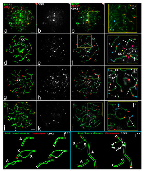 Inside the sex bivalent, numerous CDK2 foci localized along asynapsed segments; there were single CDK2 signals in one or both synaptic segments (Figure 3e–f’ and Figure 4b,d,f). In the mid pachytene, all bivalents fully synapsed except the sex bivalent. At this stage, numerous CDK2 signals were detected in the asynaptic zone of the sex bivalent (9.83 ± 0.49 foci for first X and 8.01 ± 0.39 for second X) (Figure 3g–i’ and Figure S5). Autosomal bivalents demonstrated telomeric and interstitial localizations for CDK2 on the fully synapsed chromosomes (Figure 3f,f’,f″,i,i’,i″). Progressive desynapsis of homologs occurred during the diplotene (Figure 3j), and only a few bivalents retained telomeric and interstitial CDK2 sites (Figure 3k–l’).