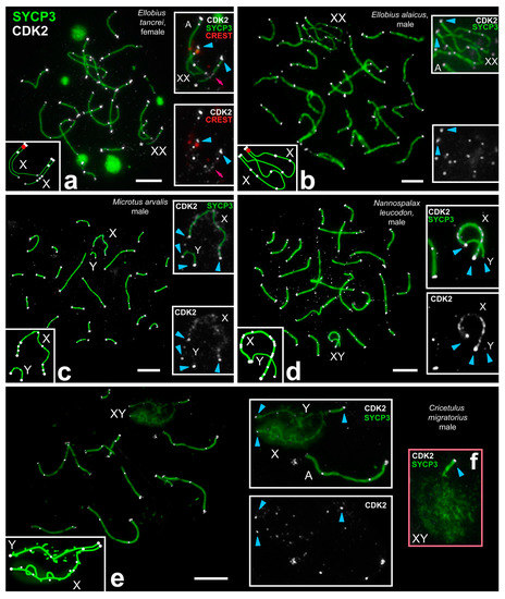 CDK2 localization in meiotic chromosomes of males and females of distinct rodent species. In all species, CDK2 (white) localized in the telomeric and interstitial sites of autosomes (A). Blue arrowheads point to telomeric CDK2 localization in sex bivalents (XY). Schemes of sex chromosome synapsis, centromeric regions, and CDK2 dots are shown in the left bottom insets (a–e). (a) Pachytene oocyte of the mole vole E. tancrei. An incomplete synapsis occurred in the central part of the sex (XX) bivalent (white star). There were different CDK2 signals: Strong ones in the telomeric and interstitial sites, and weak signals in the synapsed parts of the sex bivalent (pink arrow). (b) Pachytene spermatocytes of the mole vole E. alaicus. CDK2 signals were detected in the telomeric and interstitial sites for all bivalents. A weak CDK2-cloud was visualized around the asynaptic area of XX. (c) In the pachytene spermatocyte of the vole M. arvalis X and Y were asynaptic (without synapsis between them). The X chromosome showed numerous CDK2 foci (not intense here). The Y chromosome showed CDK2 foci in telomeric sites only. (d) In the pachytene spermatocyte of the mole rat N. leucodon numerous CDK signals appeared in the asynaptic part of the X chromosome. Y had telomeric CDK2 foci only. (e) Pachytene spermatocytes of the hamster C. migratorius. Autosomes had the same regularities: Telomeric and one or two interstitial sites were CDK2-positive. Rare CDK2-dots were identified in asynaptic regions of XY. (f) In the late pachytene hamster spermatocyte, asynaptic X- and Y-axes had diffused SYCP3. Scale bar (a–e) = 5 µm.