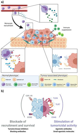Tumour-associated macrophages modulate the breast cancer microenvironment. (a) The breast cancer (BC) microenvironment is composed by stromal cells (as fibroblasts, adipocytes, endothelial cells) and the immune infiltrate. Immune cells, such as T lymphocytes, natural killer (NK) cells and monocytes, are recruited to the tumour site at early stages. Monocytes are recruited from the bloodstream by chemokines secreted by the tumour cells, such as C-C motif chemokine ligand 2 (CCL2) and CCL5 (top inset). Within the BC microenvironment, monocytes polarize into immunosuppressive tumour associated macrophages (TAM), in a process regulated by cytokines, growth factors, and other signals secreted by tumour and stromal cells, such as interleukin 10 (IL-10), colony stimulating factor 1 (CSF-1), and lactate, recognized by the IL-10 receptor (IL-10R), the CSF-1 receptor (CSF1R), and G protein-coupled receptor 132 (Gpr123) (bottom left inset). The recognition of highly glycosylated proteins on tumour cells, such as mucin 1 (MUC1) and cluster of differentiation 24 (CD24), by immune glycan-binding receptors (lectins) also contribute to polarization into immunosuppressive TAM phenotypes (bottom right inset). TAM represent a high fraction of the microenvironment of human epidermal growth factor receptor 2 (HER2) overexpressing BC and triple negative BC (TNBC), being implicated in the modulation of stromal cells into a protumour phenotype and suppression of other immune cells, such as regulatory T cells and NK cells. (b) Macrophages as targets for novel immunotherapies. Due to the relevance of TAM in promoting an immunosuppressive BC microenvironment, they have been proposed as therapeutic targets for immunotherapy. Strategies that have reached clinicals trials include (i) blockade of the axes responsible for macrophage recruitment and survival, such as CCL2 and CSF-1 and (ii) stimulation of TAM tumoricidal activity, by triggering the TLR4, TLR7 or CD40-mediated pathways [4,21,22,23].