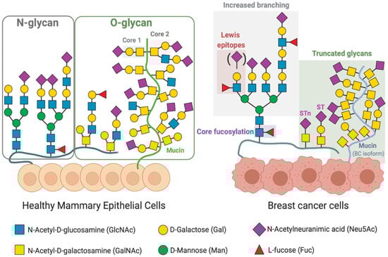 Altered glycosylation patterns of surface glycoproteins on breast cancer cells. Healthy mammary epithelial cells present at their surface diverse glycans, which are attached by a N-Acetylglucosamine (GlcNAc) to an asparagine (Asn) site—N-glycans—or by a N-Acetylgalactosamine (GalNAc) to a serine/threonine site (Ser/Thr; mucin-type O-glycans). Upon tumorigenesis, BC cells acquire a deregulated synthesis of glycans, which influences interactions between tumour cells and the surrounding microenvironment. Altered glycosylation in BC is characterized by an increase in Lewis antigens (Lewisa and Lewisx; the sialylated Lewisx and Lewisa) and an increase in α1-6-core fucosylation and branching of N-glycans. Additionally, truncated O-glycans are highly expressed in BC usually with terminal sialic acid. Monosaccharides are represented according to the symbol nomenclature for glycans (SNFG) [8,37,39,41].