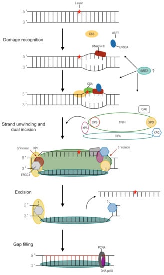 - Wood, R.D.; Araujo, S.J.; Ariza, R.R.; Batty, D.P.; Biggerstaff, M.; Evans, E.; Gaillard, P.-H.; Gunz, D.; Koberle, B.; Kuraoka, I.; et al. DNA Damage Recognition and Nucleotide Excision Repair in Mammalian Cells. Cold Spring Harb. Symp. Quant. Biol. 2000, 65, 173–182. [Google Scholar] [CrossRef]