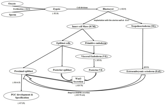 Diagrammatical outflow of the PGC development and specification in mice. Oocyte and sperm after getting fertilized produces zygote. While undergoing further cell divisions, zygote attain blastocyst stage at around embryonic development day 3.5 (~E3.5) having an outer trophoblast cell monolayer and pluripotent inner cell mass (ICM) which is further separated into epiblast and primitive endoderm. Implantation of the blastocyst with the uterine wall takes place at ~E4.5. Further developmental stages are comprised of extraembryonic ectoderm (ExE) development from trophoectoderm and visceral endoderm (VE) from primitive endoderm. Furthermore, Wnt3 is secreted by both of the posterior epiblast and VE and BMP4 & BMP8b secreted by ExE. Wnt3 and BMPs secretions finally assists in production of a few primordial germ cells (PGCs) from proximal epiblast and finally PGC specification takes place.