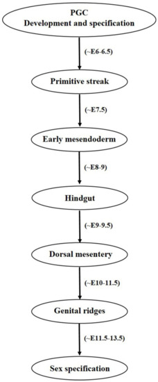 Once the PGCs are formed, their migration to gonadal ridges constitutes an important developmental step towards gamete specification and their proper functioning. It is worth noticing that the concept of signaling guidance for PGCs towards the gonads was first of all described in zebrafish [25]. Both intrinsic motility factors and external guidance cues are required by the PGCs to successfully migrate and maintain their survivability [26]. In the beginning, BMP signaling from ExE governs PGC formation from epiblast cells, which are further mediated by BLIMP1 or PRDM1 transcriptional regulators which not only stimulate PGC specific gene such as Stella but also suppresses the expression of somatic cell genes cascade [27,28]. Like BLIMP1, PRDM14 also regulates mouse PGC specification, lacking or knockdown of both the factors either resulted into improper PGC differentiation and defected migration or induced sterility in mice models [29,30]. Along with BLIMP1 and PRDM14, AP2γ has also been found essential in regulating mammalian PGC specification [31]. AP2γ is expressed by mouse PGCs from E7.25 to E12.5 and its targeted disruption has resulted into male and female sterility. It was also believed that PGC migration in mouse is also coordinated by interferon induced transmembrane protein 1 (IFITM1), as RNA interference induced IFITM1 knockdown in the primitive streak resulted into PGC migration failure towards endoderm, indicating possible role of IFITM1 in PGC migration from mesoderm to endoderm [32]. However, contradicting results were shown by Lange UC et al. (2008), where embryonal deletion of the IFITM1 gene family could not cause impaired PGC migration [33]. During the period of migration and arrival of PGCs towards hindgut, Nanos3 plays multiple vital roles by maintaining germ cell’s undifferentiated state, protecting PGCs against apoptosis by suppressing Bax-dependent and independent pathways and thereby helps in germ cell development [34]. Nanos3 is expressed by migrating PGCs at various germ cell specific developmental stages in both testis and ovaries. Moreover, without its expression, germ cell detection in the ovary and testis is not possible [15,34]. Failure in migration can cause developmental issues and infertility, and also may cause teratoma formation in extra gonadal regions [12]. At around E11.5, most PGCs are migrated towards genital ridges and become populated there at around E12.5. During later stages, establishment of sexually dimorphic sex cords takes place between E13.5–17.5 and birth and most of the ectopic PGCs die due to apoptotic pathways and rest of them transforms into male and female gametes in their respective sex gonads [15]. Researchers believed that PGCs lose their migration properties once they associate with somatic cells and reach gonads [26]. One possible reason for their ceasing behavior may be due to the cell-to-cell interactions between PGCs and somatic cells. Proper mechanism behind this stoppage is not known and need in depth elucidation. Diagrammatical outflow of the PGC migration has been given in Figure 2.